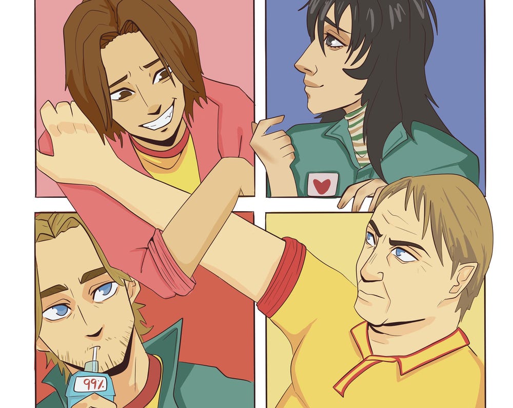 38 x 42cm tote bag featuring Anya, Daisuke, Curly and Swansea from Mouthwashing.